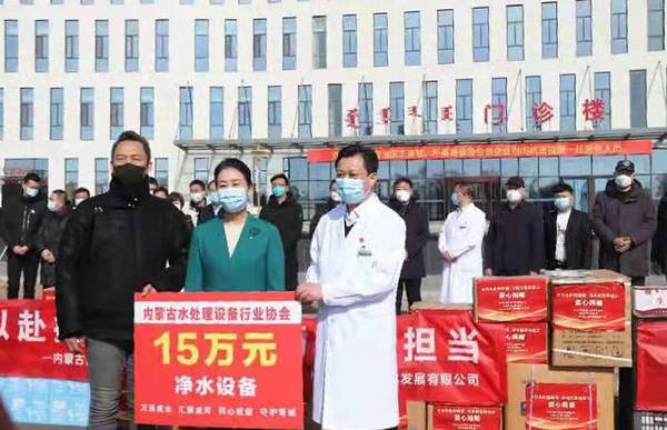 2月25日,由內(nèi)蒙古自治區(qū)工商聯(lián)組織,內(nèi)蒙古水處理設(shè)備行業(yè)協(xié)會(huì)聯(lián)合山東省凈水專委會(huì),向內(nèi)蒙古第三醫(yī)院捐贈(zèng)價(jià)值15萬(wàn)凈水設(shè)備和100件蘇打水。當(dāng)天,內(nèi)蒙古自治區(qū)黨委統(tǒng)戰(zhàn)部副部長(zhǎng)、自治區(qū)工商聯(lián)黨組書記梁淑琴,內(nèi)蒙古自治區(qū)工商聯(lián)黨組成員白春艷,一級(jí)巡視員屈晨然、二級(jí)巡視員呂萬(wàn)海、武軍等出席捐贈(zèng)活動(dòng)。
