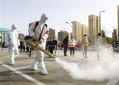 志愿者對(duì)戶外通道進(jìn)行消殺