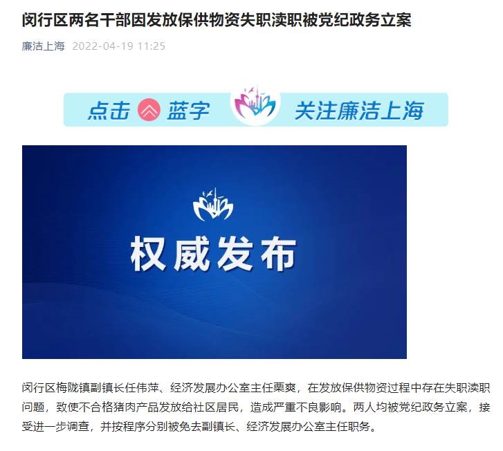 閔行區(qū)梅隴鎮(zhèn)副鎮(zhèn)長任偉萍、經(jīng)濟發(fā)展辦公室主任栗爽,在發(fā)放保供物資過程中存在失職瀆職問題,致使不合格豬肉產(chǎn)品發(fā)放給社區(qū)居民,造成嚴重不良影響。兩人均被黨紀政務(wù)立案,接受進一步調(diào)查,并按程序分別被免去副鎮(zhèn)長、經(jīng)濟發(fā)展辦公室主任職務(wù)。