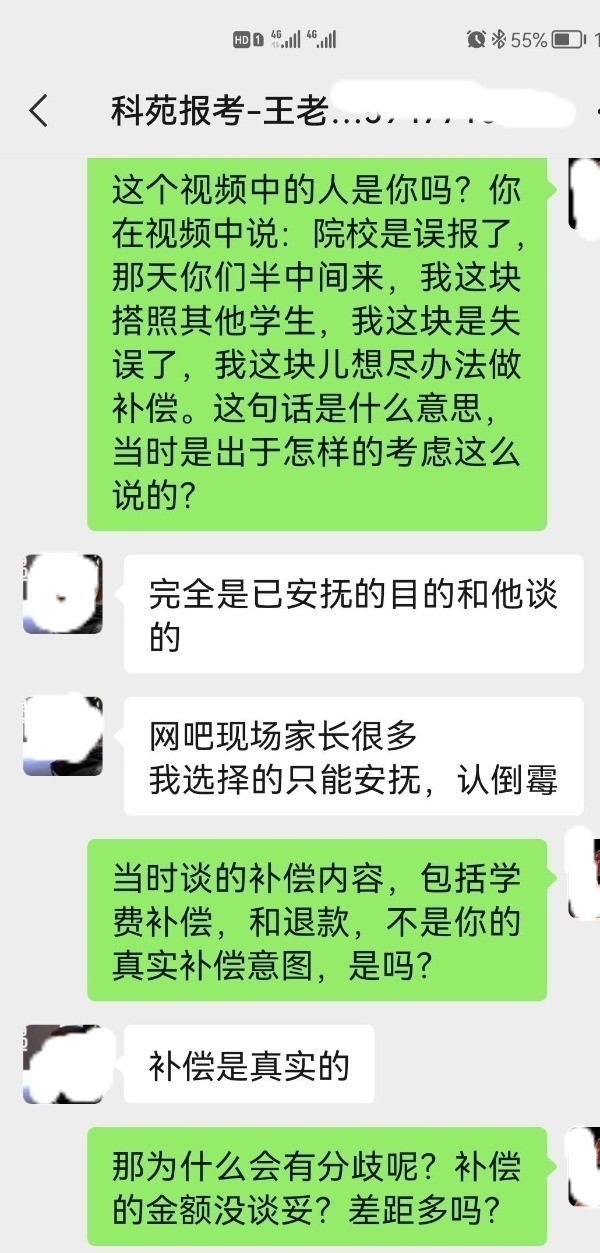 據(jù)樊女士介紹,負(fù)責(zé)給小安報(bào)志愿的是科苑報(bào)考的王金寶老師,也是內(nèi)蒙古科苑信息科技有限公司的股東之一。樊女士提供的視頻顯示,這名老師在網(wǎng)報(bào)志愿現(xiàn)場(chǎng)回復(fù)樊女士:“院校就是誤報(bào)了,因?yàn)槟翘炷銈兪前胫虚g來(lái),還有其他學(xué)生,搭照學(xué)生,我這塊兒就失誤了,我這塊兒想盡辦法做補(bǔ)償。”然而,樊女士反映,那天以后,這名老師開(kāi)始反口,不承認(rèn)誤報(bào),也不愿意按照當(dāng)天商定的補(bǔ)償方案執(zhí)行。