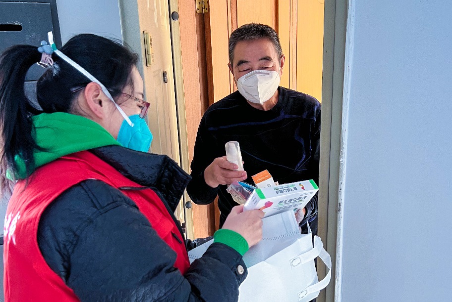 12月26日,呼和浩特市玉泉區(qū)清泉街社區(qū)黨員志愿者為困難家庭老人發(fā)放“健康防疫包”。新華網(wǎng)發(fā)(丁根厚攝)