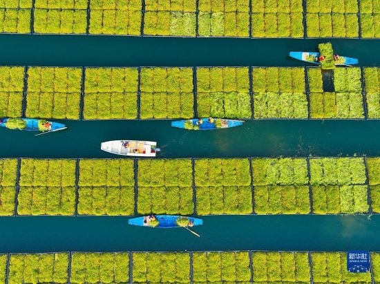 2月17日,浙江省杭州市淳安縣千島湖鎮(zhèn)坪山生態(tài)浮島上,工作人員忙著采摘水生蔬菜(無人機照片)。