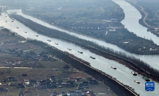 2月15日,貨船行駛在京杭大運(yùn)河江蘇揚(yáng)州段(無(wú)人機(jī)照片)。