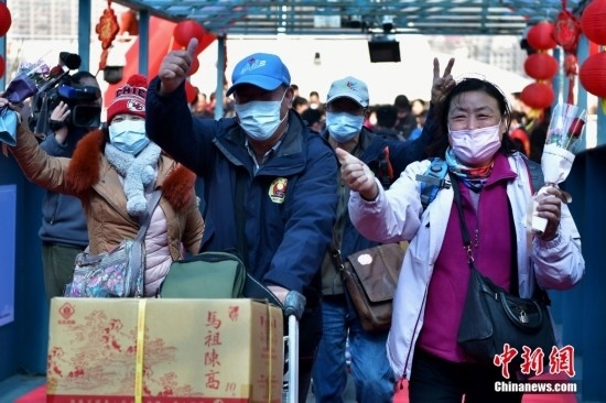 2月19日,搭載59名旅客的“吉順9號”客輪緩緩駛?cè)敫V葸B江黃岐客運(yùn)碼頭,標(biāo)志著連江黃岐至馬祖白沙“小三通”客運(yùn)航線復(fù)航。此前,廈門-金門客運(yùn)航線、福州馬尾-馬祖客運(yùn)航線、泉州-金門客運(yùn)航線已相繼復(fù)航。圖為兩岸鄉(xiāng)親在黃岐客運(yùn)碼頭激動相擁。中新社記者 張斌 攝