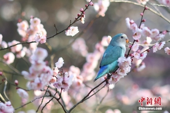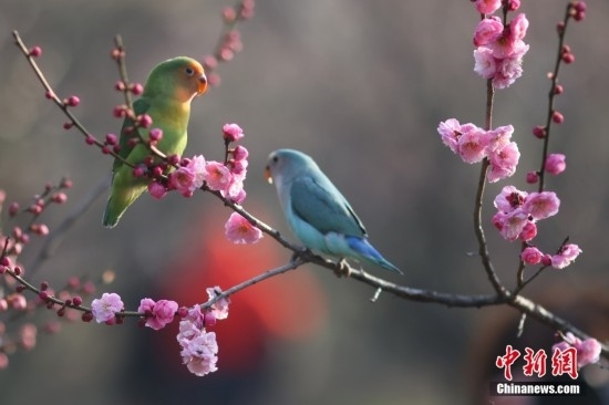 2月20日,江蘇南京,牡丹鸚鵡在梅花山梅花樹(shù)上“賞”梅。牡丹鸚鵡由南京一市民飼養(yǎng),每年在梅花盛開(kāi)的時(shí)候,他都會(huì)帶著鸚鵡來(lái)到這里“賞”梅,同時(shí)也成為一景。中新社記者 泱波 攝