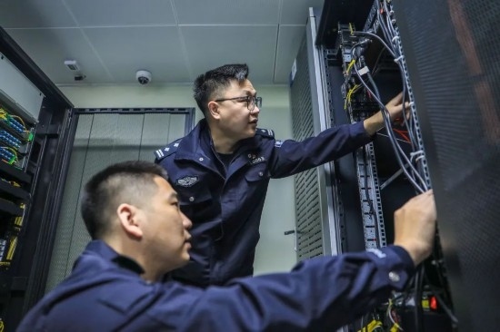 圖為歐陽軒乾與同事對服務器開展技術(shù)巡檢,及時排查故障隱患。