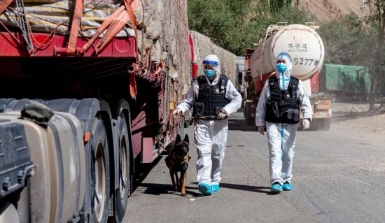 圖為疫情期間,庫地邊境檢查站移民管理警察攜警犬開展車輛查緝工作。
