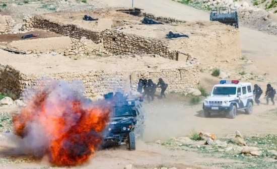新疆邊檢總站喀什邊境管理支隊開展實戰(zhàn)模擬演練。圖為該支隊移民管理警察步甲協(xié)同,圍捕藏匿在房屋內的不法分子。