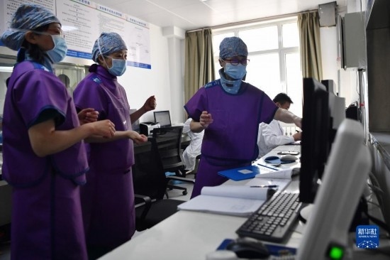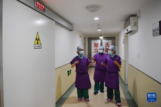 3月6日,穿上鉛衣的馬娜(左一)和同事準備進入手術室。