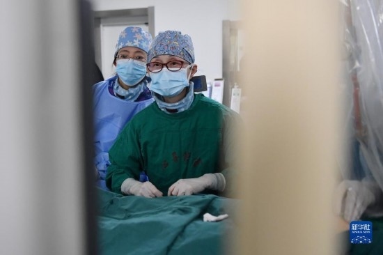 3月7日,馬娜(左)和同事在手術室為患者進行介入手術治療。