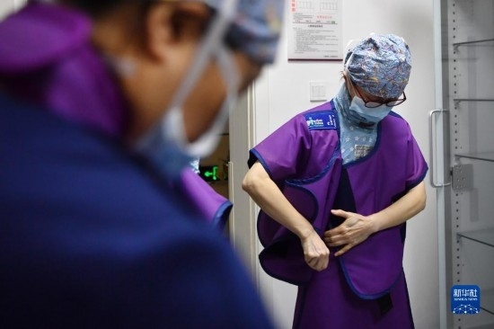3月6日,馬娜(右)和同事穿上鉛衣準備手術。