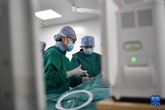 3月7日,馬娜(右)和同事在手術室為患者進行介入手術治療。