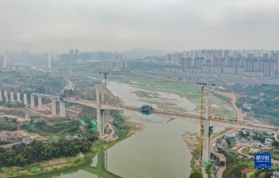 3月18日在四川省瀘州市拍攝的渝昆高鐵瀘州沱江特大橋主跨合龍施工現(xiàn)場(無人機(jī)照片)。