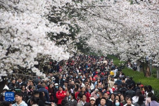 當日,武漢大學舉行抗疫醫(yī)護賞櫻專場。珞珈山下,來自全國各地的1.6萬余名抗疫醫(yī)護人員及家屬赴約賞櫻。
