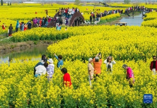 3月19日,游客在江蘇興化千垛菜花風(fēng)景區(qū)賞花拍照(無(wú)人機(jī)照片)。