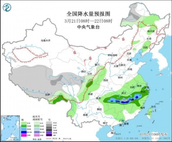 全國降水量預(yù)報(bào)圖(3月21日08時(shí)-22日08時(shí))