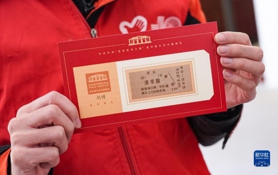 3月25日,在清華園車站舊址的專題展覽廳內,一名志愿者展示印有“老車票”的紀念卡片。