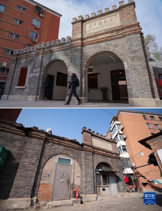 這是一張拼版照片:上圖是修繕后對外開放的清華園車站舊址(2023年3月25日攝);下圖是修繕前的清華園車站舊址(2021年4月7日攝)。