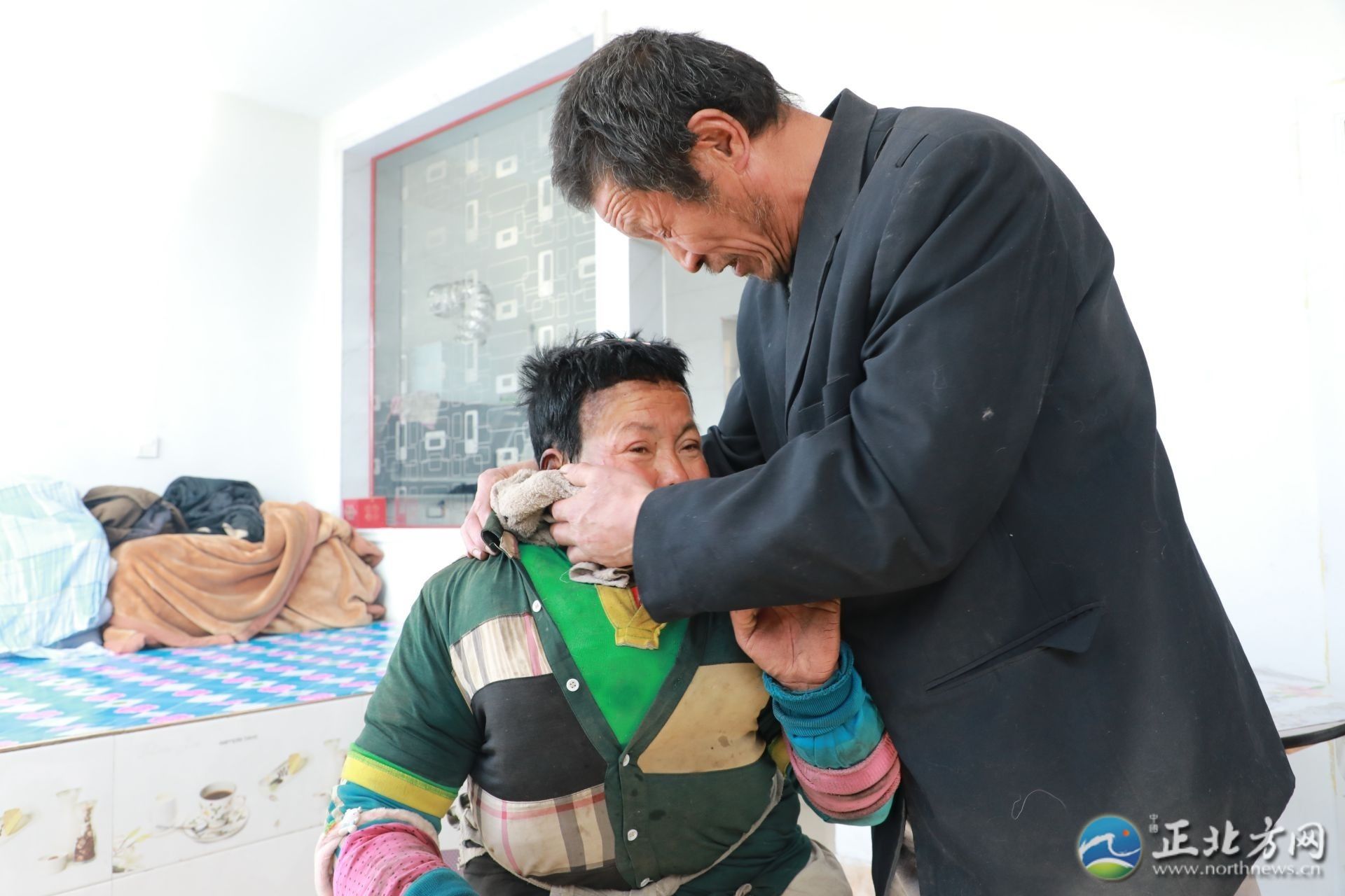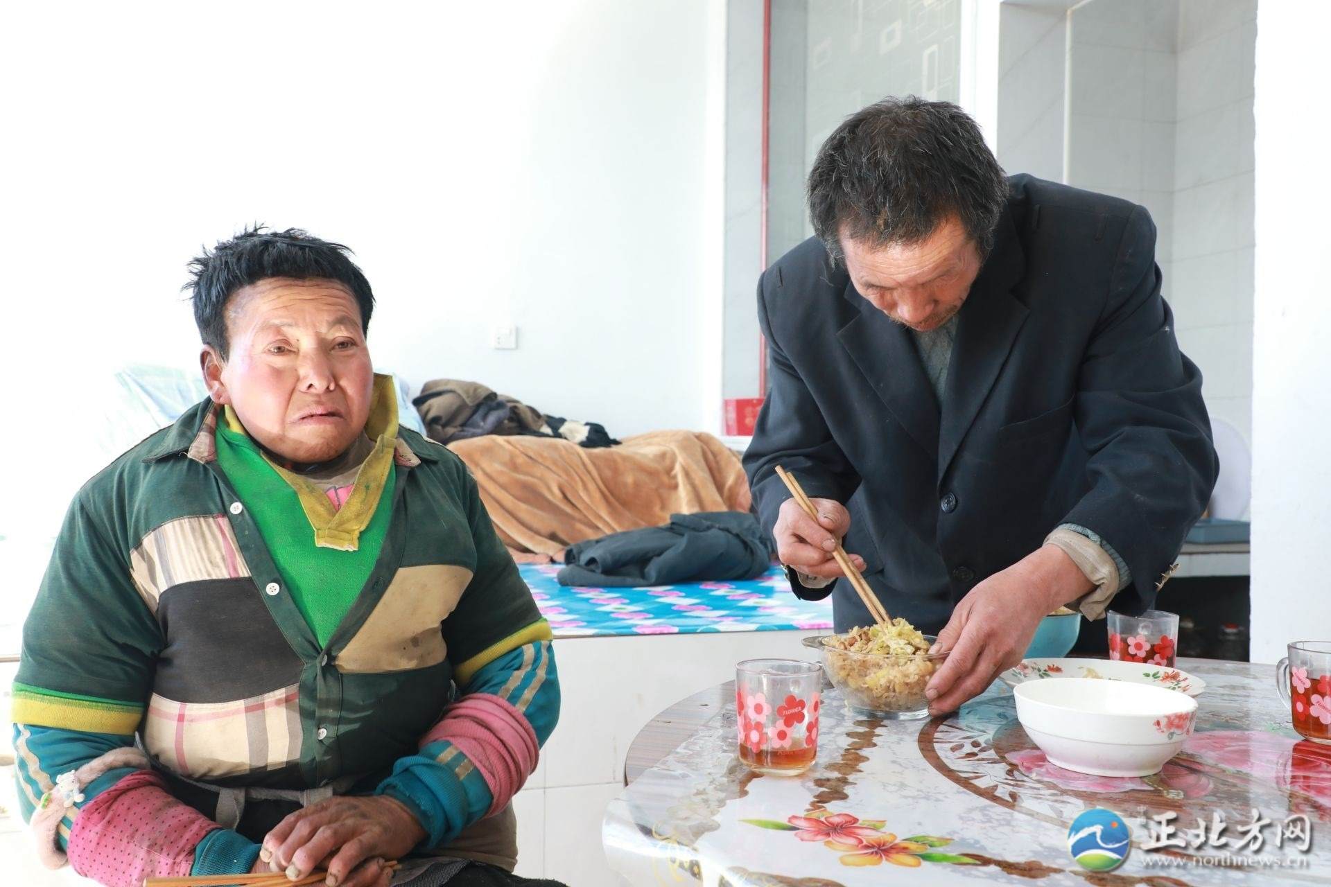 在采訪間隙,何蘭鎖的妻子王林愛(ài)回到了家,見(jiàn)到有陌生人顯得很局促。王林愛(ài)患有精神疾病,說(shuō)話顛三倒四。何蘭鎖拿起毛巾,溫柔地為妻子擦拭沾滿灰塵的臉和手,端出早早做好的飯放在桌上:“快吃吧,有你最愛(ài)吃的咸菜?!薄傲謵?ài)其實(shí)命最苦了,啥也懂不得,我要不在了,她一個(gè)人可咋辦呀。我現(xiàn)在最大的心愿是希望能讓她去接受治療。”何蘭鎖止不住地哽咽道。