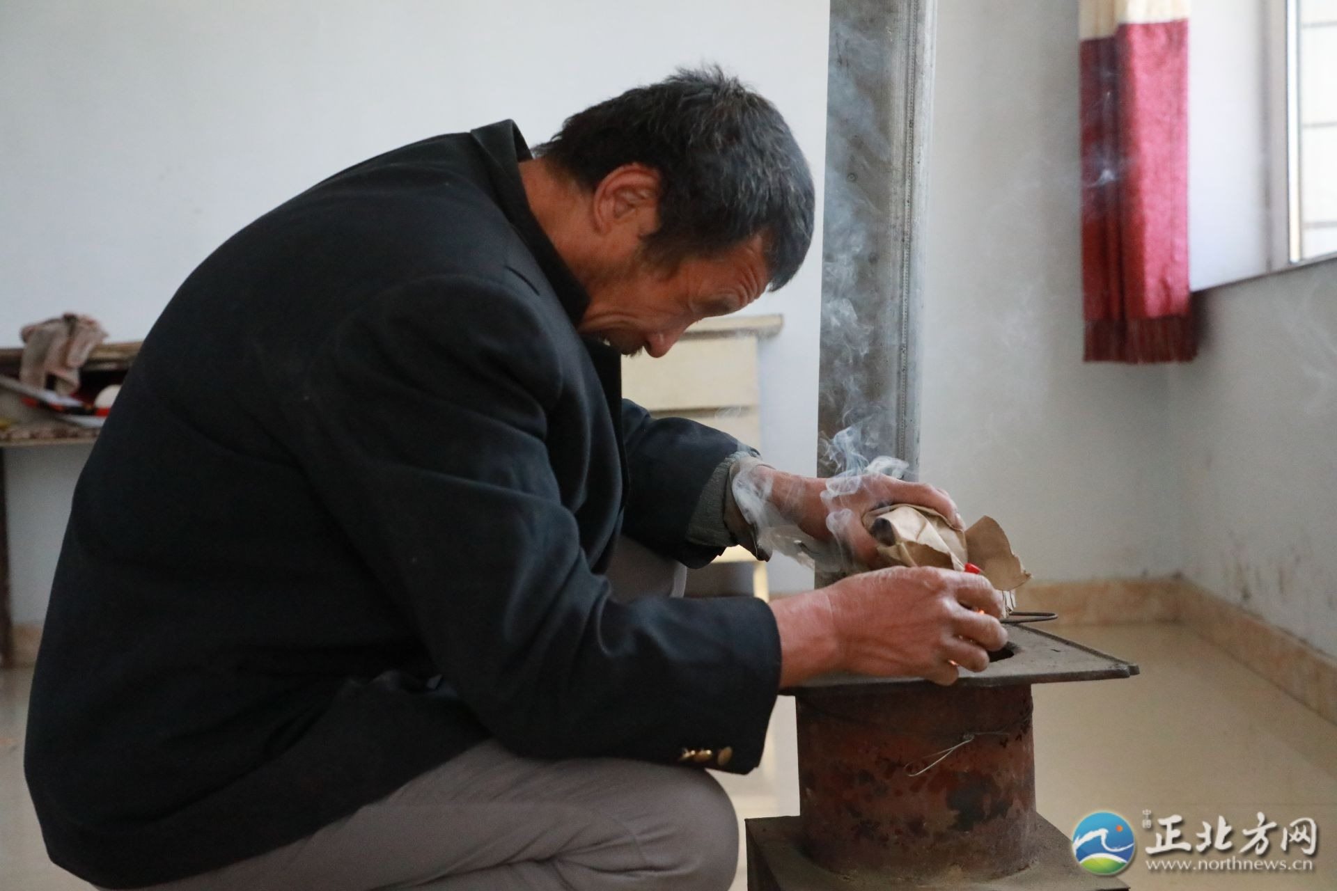 何蘭鎖63歲,黝黑的臉膛,兩個(gè)眼窩深陷,看不到眼珠。聽(tīng)到記者來(lái)采訪,他熱情地把記者讓進(jìn)屋,摸索著拿起水壺倒了兩杯熱茶,“你們稍坐一坐,家里有點(diǎn)冷。”何蘭鎖笑起來(lái)眉眼彎彎,說(shuō)著,又轉(zhuǎn)身拿著錘子,熟門(mén)熟路地進(jìn)入涼房去打炭,開(kāi)始生火。