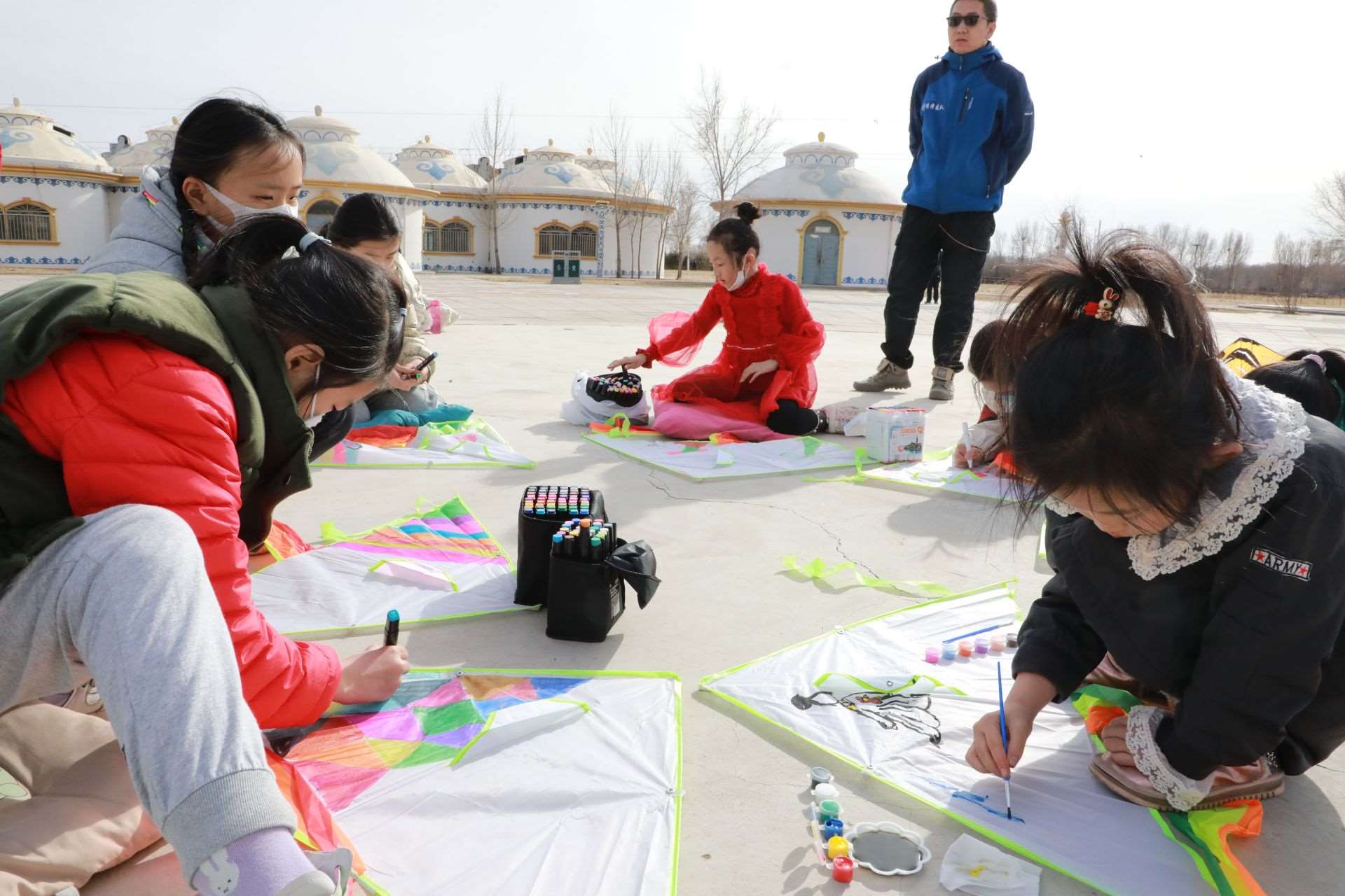 活動(dòng)現(xiàn)場(chǎng),呼和浩特市風(fēng)箏協(xié)會(huì)還特地準(zhǔn)備了20個(gè)空白風(fēng)箏,讓孩子們充分發(fā)揮想象力,動(dòng)手繪制自己喜歡的圖案。沐浴著溫暖的春光,小記者們拿出事先準(zhǔn)備好的水彩筆或者顏料,或趴或坐,認(rèn)真構(gòu)思,有的在風(fēng)箏上畫上了粉色的郁金香,有的畫上了振翅飛舞的蝴蝶,有的畫上了美麗的白雪公主,還有的涂鴉上喜歡的色塊,他們用五彩斑斕的顏色點(diǎn)綴創(chuàng)意,裝點(diǎn)自己喜歡的風(fēng)箏。一個(gè)小時(shí)的功夫,一個(gè)個(gè)獨(dú)具創(chuàng)意的風(fēng)箏在小記者們的巧手繪制中完成了。在郝偉老師的指導(dǎo)下,小記者們把風(fēng)箏安裝好,接上線,舉行了一場(chǎng)小型風(fēng)箏比賽?!巴?,成功了,起飛了!”只見數(shù)十只色彩各異的風(fēng)箏隨風(fēng)飛上天空,你爭(zhēng)我趕,越飛越高,小記者們?nèi)滩蛔“l(fā)出歡呼聲,臉上洋溢著開心地笑容。