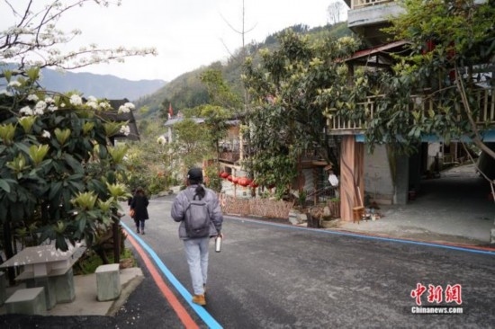 位于半山腰的石椅村也被稱為“云朵上的山寨”。此前,村里的交通不算便利,升級改造后的道路拓寬到10米左右,不僅路面鋪上了瀝青,還劃出了彩色步道,游客漫步其中,仿佛置身天然氧吧。