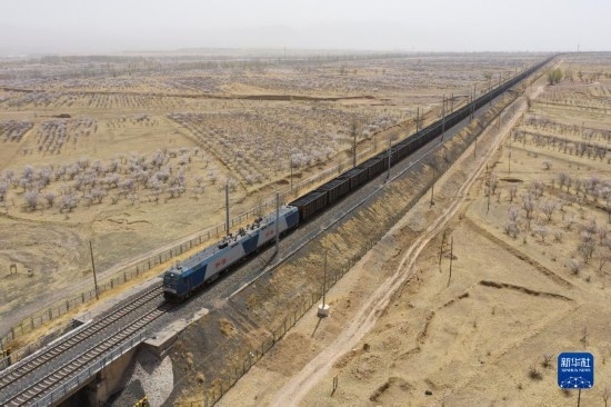 重載列車行駛在大秦鐵路上(4月11日攝,無人機照片)。