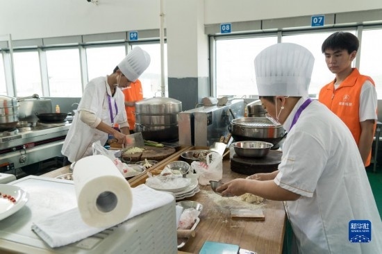 4月12日,在四川省綿陽市公共實訓(xùn)基地,參加中式面點項目的選手正在準備食材。