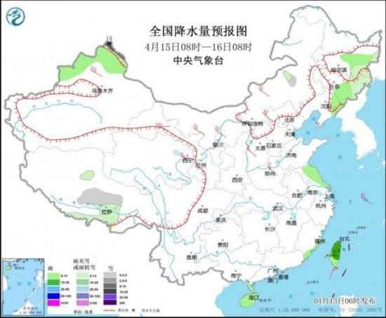 4月15日08時至16日08時,黑龍江東南部、吉林東部、新疆北疆北部、西藏南部等地部分地區(qū)有小到中雪或雨夾雪,其中,新疆北疆北部局地有大到暴雪(10~15毫米)。黑龍江東部、吉林東部、遼寧東部、新疆北部、江淮東部、海南島、臺灣島等地部分地區(qū)有小雨,其中,臺灣島部分地區(qū)有中雨。內蒙古中西部、西北地區(qū)中東部、華北大部等地部分地區(qū)有4~6級風,其中,新疆沿天山地區(qū)、甘肅河西等地部分地區(qū)有6~7級風。東海北部海域將有5~7級、陣風8級的西北風,臺灣以東洋面將有5~7級、陣風8級的東北風。