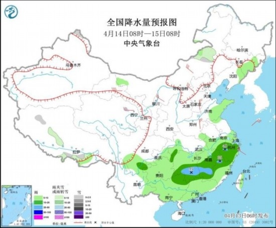 全國降水量預報圖(4月13日08時-14日08時)。圖片來源:中央氣象臺網(wǎng)站