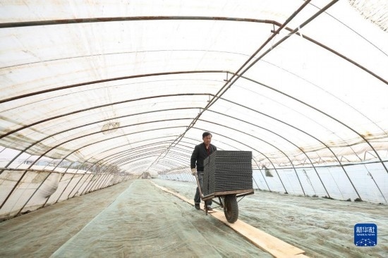 4月14日,盤(pán)錦市盤(pán)山縣的農(nóng)戶在進(jìn)行水稻秧苗育苗工作。
