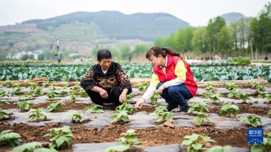 4月14日,農(nóng)技工作者在六盤水市鐘山區(qū)大河鎮(zhèn)大橋村和村民交流蔬菜種植技術(shù)。