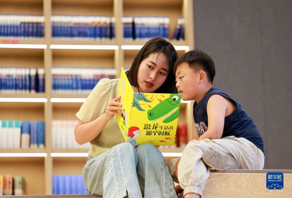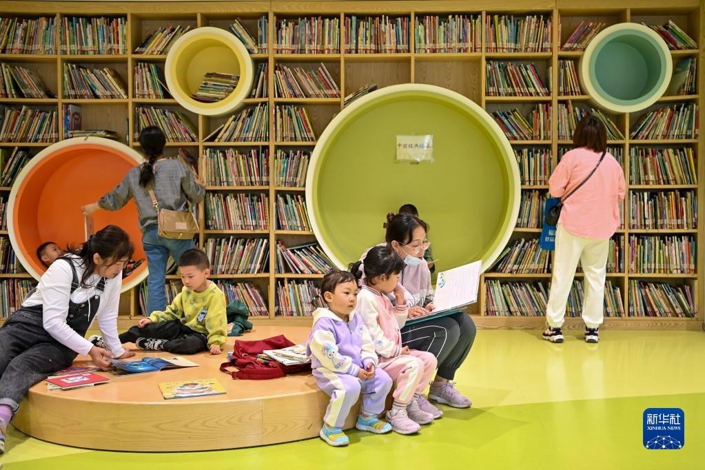 5月2日,一名家長帶著小朋友在江蘇省泰興市新時(shí)代文明實(shí)踐中心城市書房閱讀。