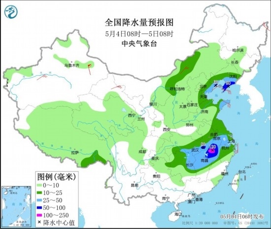 5月4日08時至5日08時,湖北南部和東部、安徽南部、湖南東北部、江西中北部、浙江西部、江蘇南部以及山東半島、遼寧南部、河北東部等地部分地區(qū)有大到暴雨,其中,安徽南部、江西北部等地部分地區(qū)有大暴雨(100~120毫米)。上述部分地區(qū)伴有短時強降水(最大小時降雨量20~40毫米,局地可超過50毫米),局地有雷暴大風等強對流天氣。內(nèi)蒙古中部、黑龍江東北部、新疆南疆盆地、甘肅河西、山東半島等地部分地區(qū)有4~6級風,其中,新疆東部部分地區(qū)有8~9級風。渤海、渤海海峽、黃海大部、東海北部海域?qū)⒂?~8級、陣風9~10級的大風。