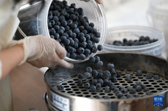 呂欣在挑選藍莓準(zhǔn)備包裝(5月3日攝)。