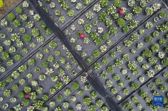 5月5日,在肥西縣經開區(qū)一家農林科技企業(yè),員工在打理繡球花(無人機照片)。
