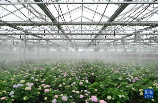 5月5日,在肥西縣經開區(qū)一家農林科技企業(yè),員工在花卉種植基地打理繡球花。