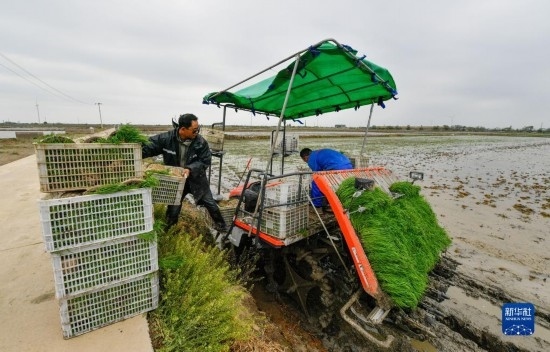 5月5日,在天津市寧河區(qū)東棘坨鎮(zhèn),農(nóng)民把秧苗放置到插秧機(jī)上。