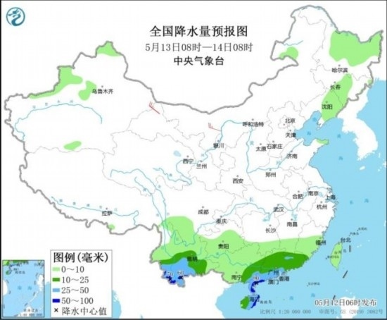 全國(guó)降水量預(yù)報(bào)圖(5月12日08時(shí)-13日08時(shí))
