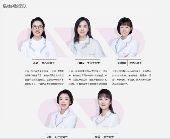 “五個(gè)女博士”官網(wǎng)信息則宣傳,該品牌成立于2019年7月,由來自北京大學(xué)的五個(gè)醫(yī)學(xué)女博士聯(lián)合創(chuàng)立,官網(wǎng)首頁還放上了五人的簡介。其主要產(chǎn)品包括膠原蛋白肽維c飲品、每日亢唐植物飲品等。