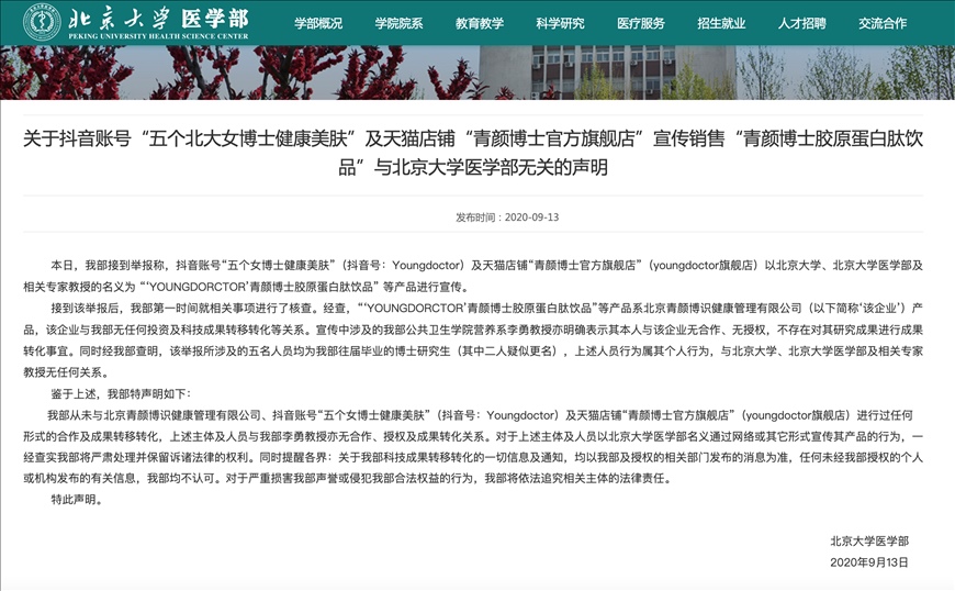 不過,北京大學(xué)醫(yī)學(xué)部曾于2020年9月發(fā)布聲明,接到舉報(bào)稱,抖音賬號(hào)“五個(gè)女博士健康美膚”及天貓店鋪“青顏博士官方旗艦店”以北京大學(xué)、北京大學(xué)醫(yī)學(xué)部及相關(guān)專家教授的名義為“‘YOUNGDORCTOR’青顏博士膠原蛋白肽飲品” 等產(chǎn)品進(jìn)行宣傳。
