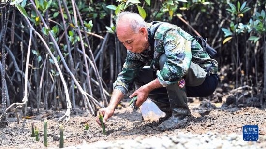 莫積瑞老人培育紅樹林種子(5月20日攝)。