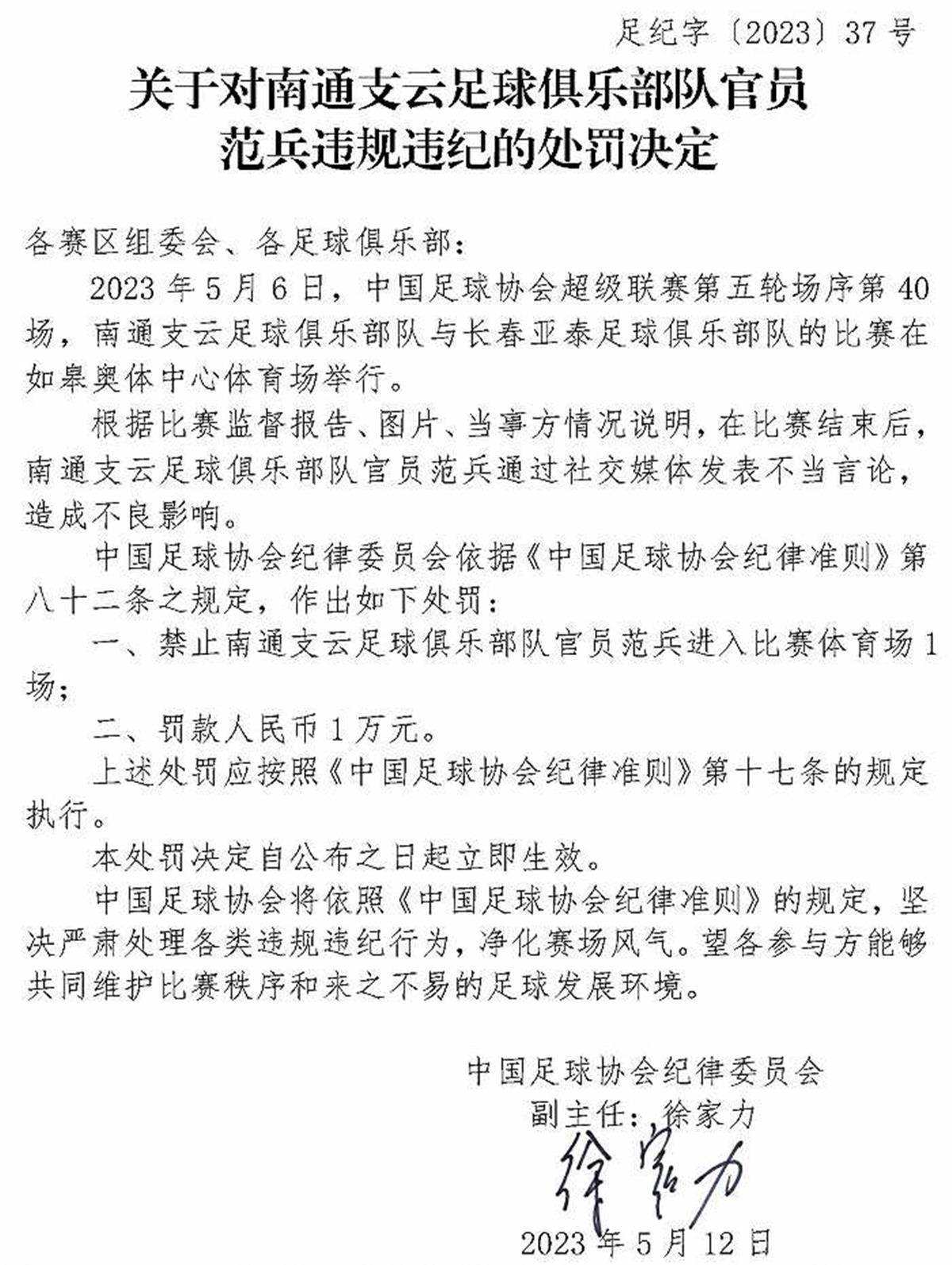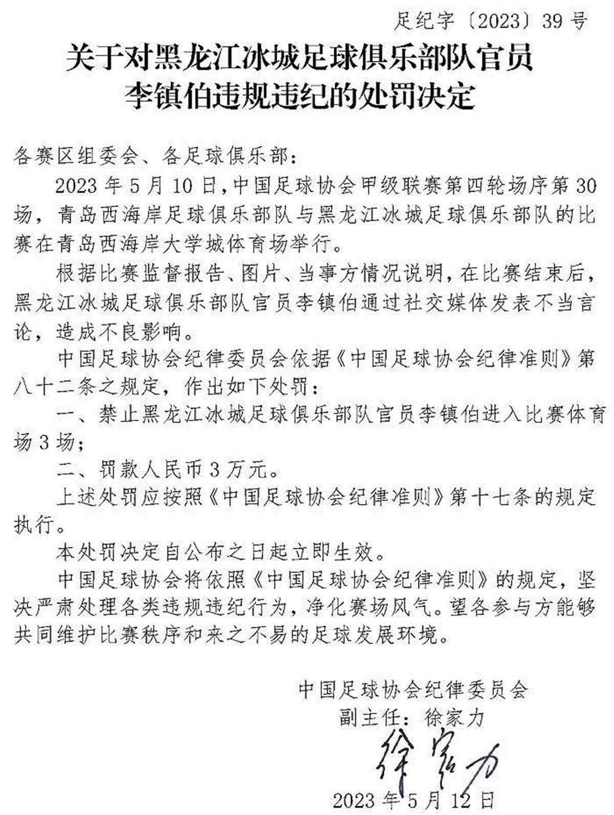 中國足協(xié)紀(jì)律委員會根據(jù)裁判員報告、比賽監(jiān)督報告、視頻、當(dāng)事方情況說明及聽證,認(rèn)定楊帆實施暴力行為,于是依據(jù)《中國足球協(xié)會紀(jì)律準(zhǔn)則》第五十三條、第四十八條之規(guī)定,對他給予停賽4場、罰款人民幣4萬元的處罰。在這張罰單上,第一次出現(xiàn)了徐家力的名字。從這張罰單來看,中國足協(xié)紀(jì)律委員會定下了基調(diào),那就是嚴(yán)厲打擊球場暴力行為。