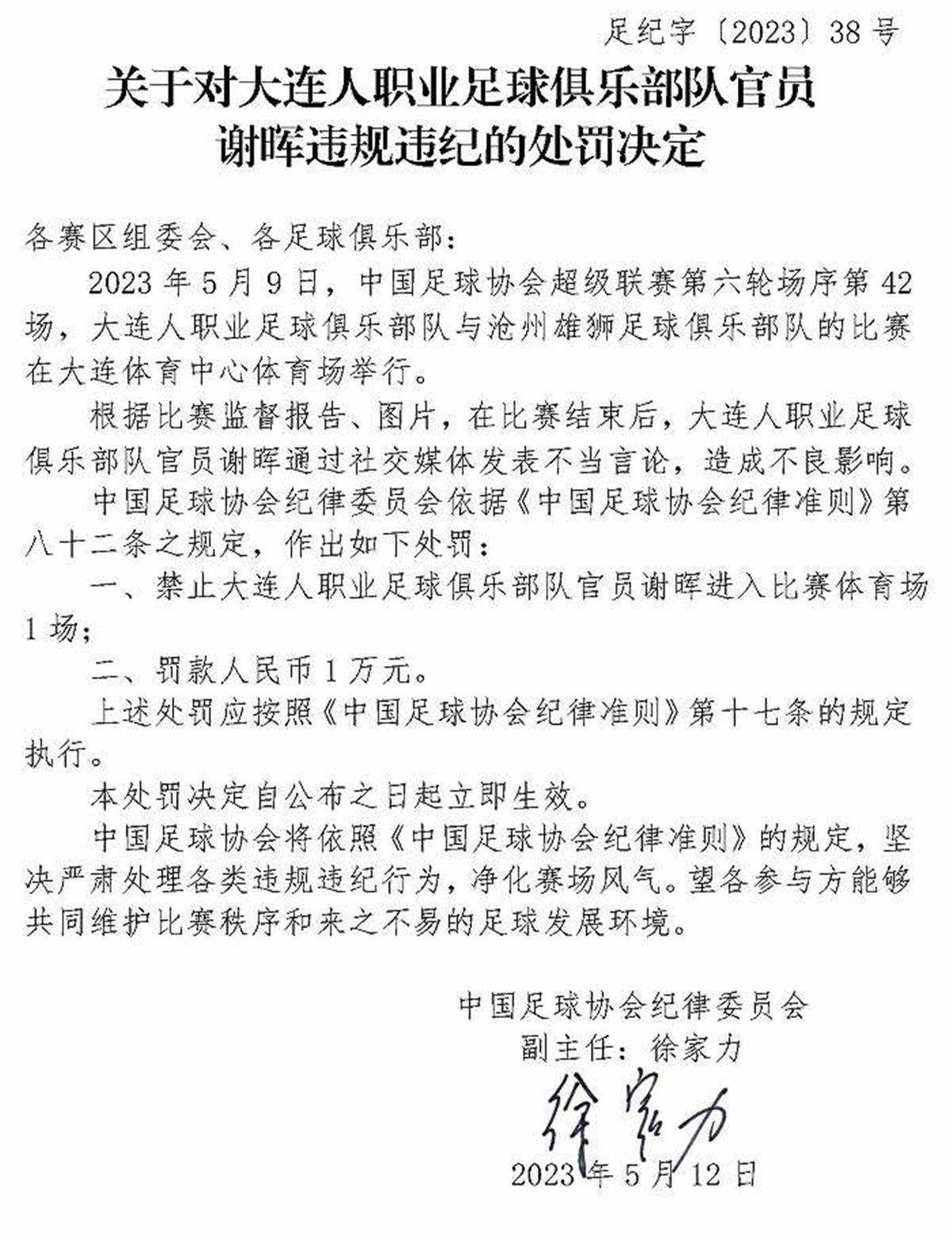 5月12日,中國足協(xié)紀(jì)律委員會接連開出三張罰單,對中超大連人隊的主教練謝暉,以及南通支云隊、黑龍江冰城隊的兩位俱樂部官員范兵和李鎮(zhèn)伯進行了處罰,共計罰款5萬元,并對三人追加禁賽。這三張罰單一出,引來外界的一片質(zhì)疑聲。