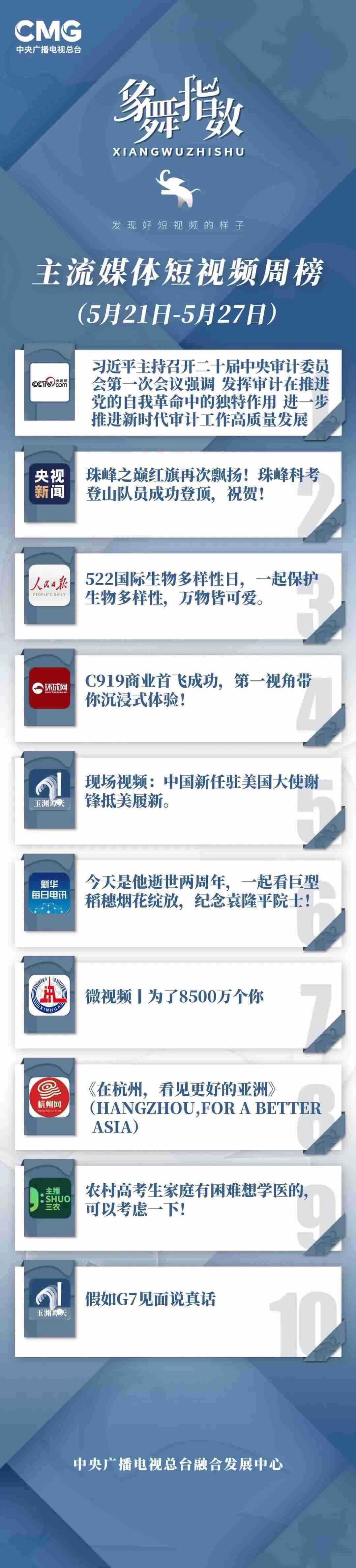 中央廣播電視總臺“象舞指數(shù)”評議品牌,推出主流媒體短視頻周榜、總臺短視頻周榜。在2023年5月21日—5月27日,這些內容引發(fā)大眾關注: