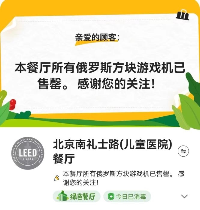 據(jù)麥當(dāng)勞介紹,活動期內(nèi)下單購買任意產(chǎn)品,額外加30元即可獲得俄羅斯方塊游戲機一個,全國限量40萬個。但當(dāng)日就有不少人表示,已經(jīng)買不到麥當(dāng)勞游戲機。記者25日登錄麥當(dāng)勞APP,北京多個門店亦顯示俄羅斯方塊游戲機已售罄。