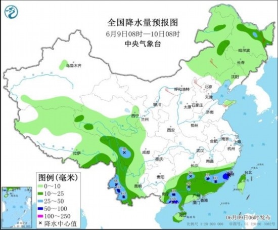 圖2 全國降水量預報圖(6月9日08時-10日08時)