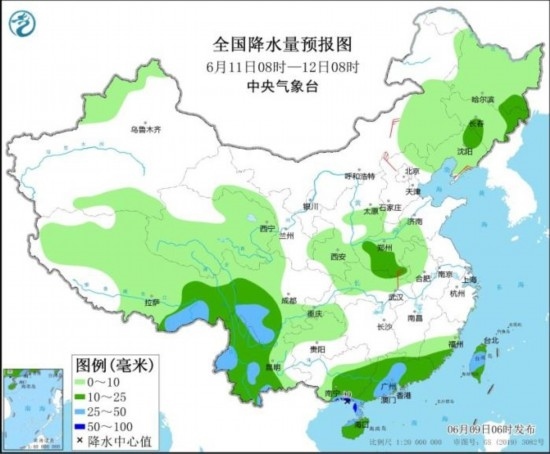 圖3 全國降水量預報圖(6月10日08時-11日08時)