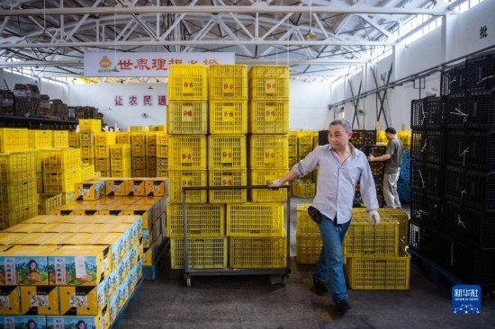 6月8日,在秭歸縣華維電商物流園區(qū)內(nèi),工作人員搬運臍橙。