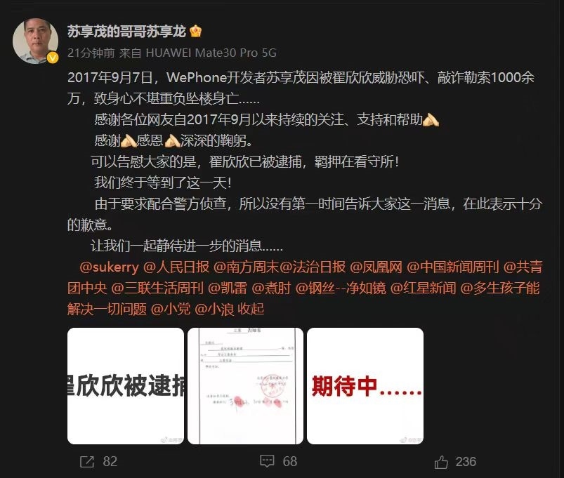 事發(fā)5年多之后,2023年6月9日,蘇享茂的哥哥蘇享龍通過個(gè)人微博稱,“翟欣欣已被逮捕,羈押在看守所?!碧K享龍?zhí)峁┑募由w北京海淀區(qū)公安局公章的立案通知書顯示,翟欣欣敲詐勒索一案,該局認(rèn)為符合立案條件,現(xiàn)立案偵查。